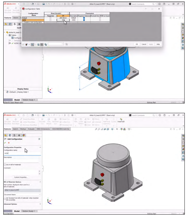 A Konfigurációk lehetővé teszik egy alkatrész vagy összeállítás több változatának létrehozását egyetlen fájlon belül. Ezek a variációk eltérő méretekkel, műveletekkel, alkatrészekkel vagy tulajdonságokkal rendelkezhetnek. Lehetővé teszi a tervezési variánsok kezelését anélkül, hogy minden egyes verzióhoz külön fájlt kellene létrehozni. Még mielőtt az adatkezelő rendszerek elterjedtek volna, a Konfigurációk segítették a mérnököket a termékcsaládok modellezésében, és továbbra is széles körben használják a gyors iterációhoz.