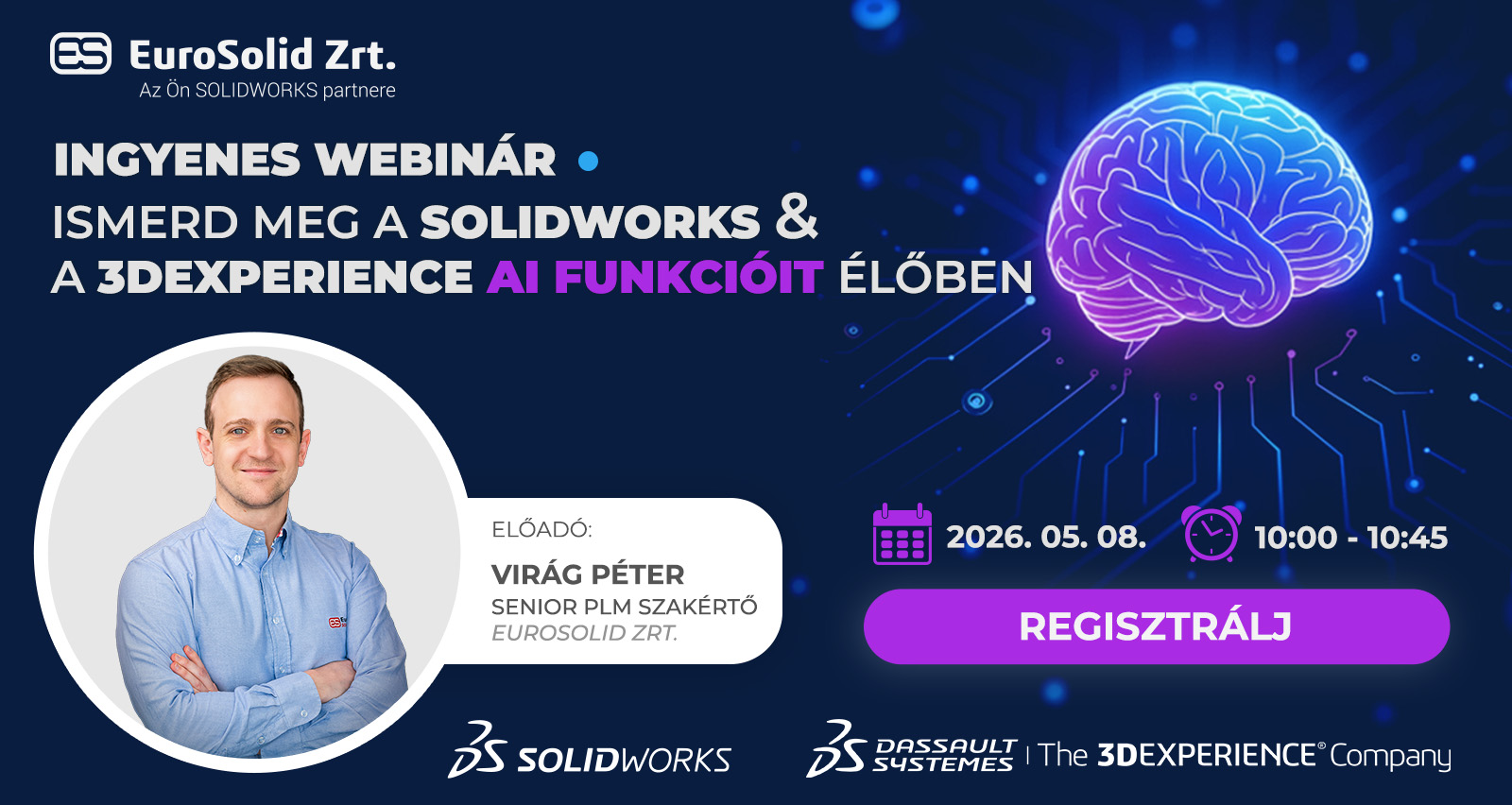 2026. május 8-án Virág Péter, az EuroSolid Zrt. Senior PLM Szakértője egy ingyenes, 45 perces webinárán mutatja be a SOLIDWORKS és a 3DEXPERIENCE platform legújabb AI fejlesztéseit.