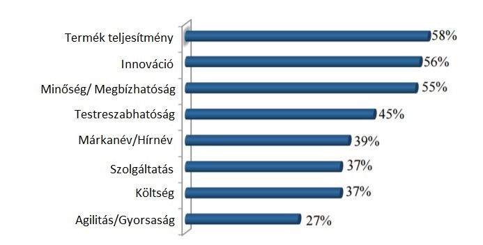 A leggyakoribb megkülönböztetési stratégiák A tanulmány szerint a termékközpontú stratégia hatására a válaszadók ma már jobban fókuszálnak arra, hogy termékeiket közvetlenül az ügyfélhez juttassák el, és kevésbé a piacra kerülés idejére és költségeire. Ezek ugyan nem szerepelnek a megkülönböztető tényezők listáján, de fontos szempontok a versenyképességet tekintve a zsúfolt, globális piacon. Továbbá a cégek már nem csak egy területre összpontosítanak, hiszen ahhoz, hogy versenyképesek legyenek, sokoldalúnak is kell lenniük. Ez ösztönöz sok céget arra, hogy tervezési folyamataikba invesztáljanak.